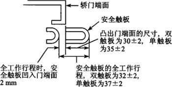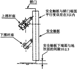 (2)调整上、下摆杆座的位置,并把安全触板的倾斜度(与门端的平行度)调整在3mm以内,如图7.7-6所示。