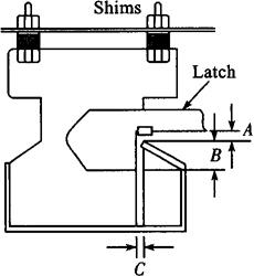 图22.1-3 厅门锁与门锁盒各项间隙结构 A、B、C三间隙应该保证在: A=0~3mm B=13~16mm C=1.5~2mm (1)如果间隙A、B不符合,可以通过调整门锁安装螺栓来调节(图22.1-4),但一般都是通过调整门锁盒上的垫片来调整的。
