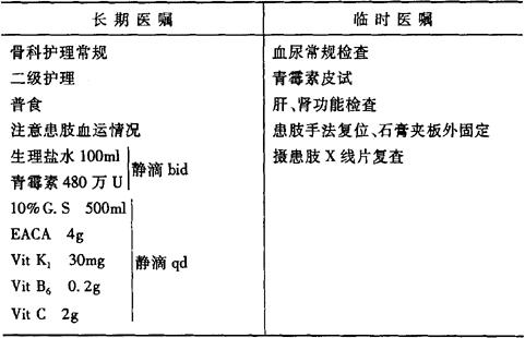 说明:(1)止血药及抗生素一般使用3~5天。 (2)出院后医嘱应包括:维持石膏外固定6~8周;患肢在4个月内免负重;非固定部分加强功能锻炼;定期门诊复诊、每2个月摄X线片复查一次至骨折愈合。 |