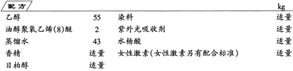 除水、染料外,按配比将其余成分溶于乙醇中,然后加入蒸馏水、染料,过滤,包装,即为成品。
