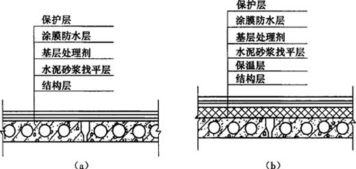 图8-2 涂膜防水屋面构造 (a)无保温层涂膜屋面;(b)有保温层涂膜屋面 (一)涂膜防水施工的一般方法 涂膜防水屋面施工的一般工艺为:基层表面清理→喷涂基层处理剂(底涂料)→特殊部位附加增强处理→涂布防水涂料及铺贴胎体增强材料→清理与检查修理→保护层施工。 涂膜防水的施工顺序应按“先高后低、先远后近”的原则进行。遇到高低跨屋面时,一般先涂布高跨屋面,后涂布低跨屋面;在相同高度的屋面上,要合理划分和安排施工段,先涂布距上料点远的部位,后涂布距上料点近的部位;在同一屋面上,先涂布排水较集中的水落口、天沟、檐口等节点部位,后再进行大面积涂布。 (二)沥青基涂料施工要点 在沥青基涂料的施工过程中,关键是掌握好涂刷基层处理剂、涂布防水涂料和铺贴胎体增强材料三大施工工艺。 1.涂刷基层处理剂 基层处理剂一般采用冷底子油,在涂刷基层处理剂时,应做到品种适宜、均匀一致、覆盖完全。当采用石灰乳化沥青防水涂料时,夏季可采用石灰乳化沥青稀释后作为冷底子油涂刷一道,春秋季宜采用汽油沥青冷底子油涂刷一道。当采用膨润土、石棉乳化沥青防水涂料时,可不涂刷基层处理剂。 2.涂布防水涂料 涂布防水涂料时,一般先将防水涂料直接分散倒在屋面基层上,用胶皮刮板来回刮涂,使涂料达到厚薄均匀一致,不露底、不存在气泡、表面平整,然后待其干燥。 3.铺贴胎体增强材料 需要铺设胎体增强材料时,由屋面最低处向上施工。在天沟、檐口、泛水或其他基层采用卷材防水时,卷材与涂膜的接缝应顺流水方向搭接,搭接宽度不应小于100mm。 一般采用湿铺法,即在头遍涂层表面刮平后,可立即铺贴胎体增强材料,铺贴的胎体增强材料应平整、不起皱,但也不能拉伸过紧。铺贴后用刮板或抹子轻轻刮压或抹压,使布网眼中充满涂料,待干燥后再进行第二遍涂料的施工。 (三)改性沥青及合成高分子涂料的施工要点 高聚物改性沥青防水涂料和合成高分子防水涂料,在用于涂膜防水屋面时,其设计涂膜总厚度在3mm以下,所以称为薄质涂料,两者施工方法基本相同。 1.涂刷基层处理剂 高聚物改性沥青防水涂料和合成高分子防水涂料防水层的基层处理剂,有水乳型防水涂料、溶剂型防水涂料和沥青溶液三种。 (1)水乳型防水涂料 水乳型防水涂料可用掺0.2%~0.5%乳化剂的水溶液或软化水将涂料稀释,其用量比例一般为:防水涂料∶乳化剂水溶液(或软水)=1∶(0.5~1.0)。 (2)溶剂型防水涂料 由于溶剂型防水涂料的渗透能力比水乳型防水涂料强,所以溶剂型防水涂料可在基层上进行薄涂处理。 (3)沥青溶液 沥青溶液(即冷底子油)可在高聚物改性沥青防水涂料中作为基层处理剂,或在现场以煤油∶30号石油沥青=60∶40的比例配制而成的溶液作为基层的处理剂。 基层处理剂涂刷时,应用刷子用力薄涂,使处理剂尽量刷进基层表面的毛细孔中,并将基层上未清除干净的少量灰尘,像填充料一样混入处理剂中,这样不会影响涂层与基层的牢固粘结。 2.涂刷防水涂料 涂刷防水涂料的方法有人工涂布和机械喷涂两类。人工涂布可用棕刷、长柄刷、胶皮板、圆滚刷等工具进行。 用刷子涂刷防水涂料时,一般可采用蘸刷法,也可采用倒料涂刷法。涂布时应先涂立面,后涂平面。立面最好采用蘸刷法,涂刷应均匀一致。平面可采用倒料涂刷法,但要注意控制涂料均匀倒洒,不可倒得过多,否则涂料难以涂刷均匀,会造成厚薄不同。 涂刷和喷涂必须按试验确定的遍数进行,切不可为省事、省力和省料随意减少,也不可一遍涂刷过厚。前一遍涂层干燥后,应将涂层上的灰尘、杂质清理干净后,再进行后一遍涂层的涂刷。 3.铺胎体增强材料 在涂刷第二遍涂料时,或在涂刷第三遍涂料前,即可加铺胎体增强材料。由于涂料与基层粘结力较强,涂层厚度较薄,胎体增强材料不容易出现滑移,因此,胎体增强材料应尽量顺屋脊方向铺贴,以方便施工、提高劳动效率。 (四)涂膜保护层的施工要点 (1)采用细砂等粒料作为涂膜保护层时,应在刮涂最后一道涂料时,边涂边撒布粒料,使细砂等粒料与防水层粘结牢固。在撒布粒料时,要做到均匀、不露底、不堆积。 (2)在水乳型防水涂料防水层上用细砂等粒料作为保护层时,撒布后应立即进行辊压。因为在水乳型防水涂膜上撒布不同于在溶剂型防水涂膜上撒布,粒料与涂膜的粘结性较差,所以应当通过辊压使粒料与涂膜牢固粘结。 (3)采用浅色涂料作为涂膜保护层时,应在涂膜固化后才能进行保护层涂刷。这样才能使得保护层与防水层粘结牢固,又不至于使防水层与保护层涂料的颜色混杂,充分发挥保护层对防水层的保护和装饰作用。 (4)保护层材料的选择,应根据设计要求及所用防水涂料的特性而确定。一般薄质涂料可用浅色涂料或粒料作为保护层,厚质涂料可用粉料或粒料作为保护层。 (五)涂膜防水施工注意事项 (1)涂膜防水层严禁在雨天、雪天施工;五级风及五级风以上的天气不得施工;预计涂膜在固化前下雨时不得施工。在施工中如果遇到雨雪,应采取遮盖措施加以保护。 (2)沥青基防水涂膜在气温低于5℃或高于35℃时不宜施工;高聚物改性沥青防水涂膜和合成高分子防水涂膜,当为溶剂型时,施工的环境温度宜为-5~35℃;当为水乳型时,施工的环境温度宜为5~35℃。 (3)涂膜防水层的基层应符合规范规定的要求,对由于强度不足引起的裂缝,应进行认真