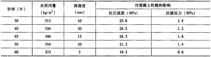 注:1.表中石子的粒径为5~20mm,若石子最大粒径为40mm时,用水量减少5~10kg/m3。表中石子按卵石考虑,若采用碎石时,用水量增加5~10kg/m3。 2.表中采用火山灰质硅酸盐水泥,若采用普通硅酸盐水泥时,则用水量增加5~10kg/m3。 但是,工程实践和试验证明,如果混凝土的水灰比大于0.60,混凝土耐久性重要指标抗冻性则明显下降,则其抗渗性也相应降低。因此,对于抗渗性要求较高的混凝土,其水灰比一般应控制在0.55以下。 (2)水泥用量 当混凝土的水灰比确定之后,水泥用量直接影响着混凝土的抗渗性。足够的水泥用量是保证混凝土中水泥砂浆数量和能否提高密实度的关键。在砂率固定的条件下,若水泥用量过小,则水泥不能充分包裹砂的表面,不仅使混凝土拌合物干涩,而且会使混凝土内部产生孔隙,从而降低密实度,导致抗渗性下降。因此,对于普通防水混凝土,无论从强度还是抗渗性要求,均应有一个水泥最小用量。 在普通混凝土中加入粉细料可以改善砂的级配,填充一部分砂粒之间的微小空隙,间接地降低混凝土的水灰比,使混凝土的密实度和抗渗性有一定提高,粉细料一般采用粉煤灰、火山灰、石粉和磨细砂等。 在实际工程中,在选定普通防水混凝土配合比时,对于不掺粉细料的,水泥用量不得少于300kg/m3;对于掺活性粉细料的,水泥用量不得少于280kg/m3。 (3)砂率 在混凝土的水灰比和水泥用量选定之后,应选择适宜的砂率,以保证混凝土中水泥砂浆的数量和质量,减少和改变混凝土的孔隙结构,增加混凝土的密实度,提高抗渗性。试验证明,砂率对混凝土的抗压强度和抗渗性均有很大影响,其影响程度如表8-21所示。防水混凝土的砂率以35%~45%为宜。 表8-21 砂率对混凝土抗压强度和抗渗性的影响