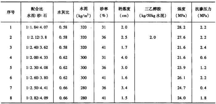 注:1.表中的百分数为水泥重量的百分数; 2.1号配方适用于常温和夏季施工,2、3号配方适用于冬期施工; 3.表中资料分子为采用100%纯度三乙醇胺的量,分母为采用75%工业品三乙醇胺的用量。 5)在冬期施工时,除了掺入占水泥重量0.05%的三乙醇胺外,再加入0.5%的氯化钠及1%的亚硝酸钠,其防水效果更好。 6)配制三乙醇胺防水混凝土必经严格控制水泥用量,当设计抗渗压力在0.8~1.2MPa时,水泥用量以300kg/m3为宜。 7)配制三乙醇胺防水混凝土,砂率必须随水泥用量的降低而相应提高,使混凝土中有足够的砂浆量,以便确保混凝土的密实性,从而提高混凝土的抗渗性。当水泥用量为280~300kg/m3时,砂率以40%左右为宜。掺三乙醇胺早强防水剂后,灰砂比可以小于普通防水混凝土1∶2.5的限值。 8)三乙醇胺防水混凝土对石子级配无特殊要求,只要在一定水泥用量范围内,并且保证有足够的砂率,无论采用何种级配的石子,都可以使混凝土具有良好的密实度和抗渗性。 9)三乙醇胺防水剂对不同品种水泥均有较强的适应性,特别是能够改善矿渣硅酸盐水泥的泌水性和粘滞性,提高其抗渗性。对要求低水化热的防水工程,以选用矿渣水泥为宜。 (2)三乙醇胺防水混凝土的施工要点 三乙醇胺防水混凝土在施工过程中,除按照普通混凝土施工有关规定外,还要严格遵循以下施工要点: 1)三乙醇胺防水混凝土的参考配合比见表8-24。 表8-24 三乙醇胺防水混凝土参考配合比