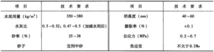 2)要求严格按照设计的配方配制三乙醇胺防水剂溶液,并充分进行搅拌,防止氯化钠和亚硝酸钠溶解不充分,或三乙醇胺在溶液中分布不均匀,而影响三乙醇胺防水混凝土的质量。 3)配制好的防水剂溶液应与拌合水混合均匀后使用,不得将防水材料直接投入混凝土搅拌机中,以防拌合不均匀,影响混凝土拌合物的质量。 4)靠近高压电源的防水工程,如果采用三乙醇胺防水混凝土,只允许单掺三乙醇胺防水剂,不能掺加氯化钠和亚硝酸钠。 4.补偿收缩防水混凝土 补偿收缩防水混凝土是用膨胀水泥,或在普通混凝土中掺入适量的膨胀剂配制而成的一种微膨胀混凝土。补偿收缩防水混凝土,适用于一般的工业和民用建筑的地下防水结构、水池、水塔等构筑物、人防、洞库以及修补堵漏、压力灌浆、混凝土后浇缝等。 补偿收缩混凝土是依靠水泥本身水化过程中形成(或掺入微量膨胀剂)大量膨胀性柱状或针状的结晶水化物——钙矾石。钙矾石在生成的过程中,不断填充、堵塞、切断连通的毛细孔道,改善了混凝土的孔隙结构,使大孔减少,孔隙率降低,抗渗性提高。 (1)补偿收缩混凝土对材料的要求 1)水泥。水泥是补偿收缩混凝土中的主要材料,水泥的质量应符合设计要求或国家规定的标准,严禁使用受潮、变质的水泥,水泥的储存期若超过三个月,应根据测试的膨胀率确定能否使用。 2)集料。石子应符合《普通混凝土碎石或卵石质量标准及检验方法》规定,石子最大粒径不大于40mm,含泥量不得大于1%,吸水率不应大于1.5%,砂岩集料不宜采用。 砂应符合《普通混凝土用砂质量标准及检验方法》的规定,砂的含泥量不应大于3%,砂中云母含量不应大于1%,海砂不宜采用。 3)拌合水。饮用水、洁净的天然水均可用于混凝土。含有害杂质的水,pH值小于4的酸性水,pH值大于9的碱性水,硫酸盐含量超过水重量1%的水及海水、工业废水不得使用。 4)外加剂。外加剂要有出厂合格证,并应符合有关产品质量标准要求。 (2)补偿收缩混凝土的配制方法 补偿收缩混凝土的配合比,首先可按普通防水混凝土的技术参数进行试配,初步选定出水灰比、水泥用量和用水量,然后按所确定的砂率计算出每立方米混凝土的砂、石用量,求出初步配合比。一般采用膨胀水泥防水混凝土的配制要求见表8-25。 表8-25 膨胀水泥防水混凝土的配制要求
