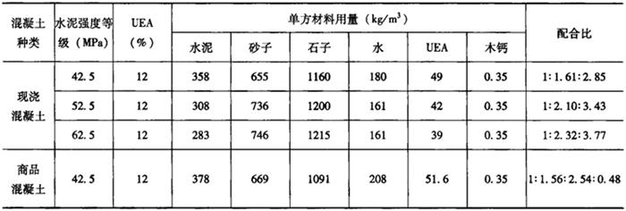 按表8-25配制要求拌制的混凝土(或采用膨胀剂拌制的混凝土),需制作强度试件和膨胀试件(包括自由膨胀试件和限制膨胀试件),以检验其是否满足设计要求。当满足设计要求即可在施工现场试拌,考虑砂石的含水率,计算出施工配合比。使用UEA混凝土膨胀剂拌制的混凝土参考配合比见表8-26。 表8-26 UEA补偿收缩混凝土配合比参考表