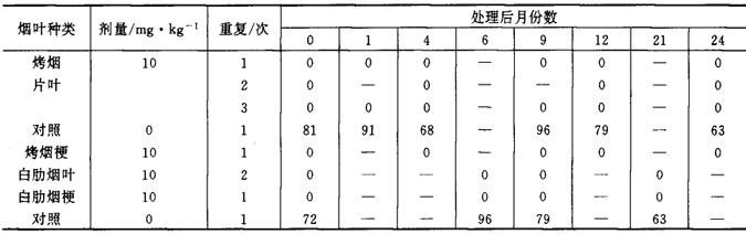 KABAT处理过的烟叶在2年内对于烟草甲虫成虫羽化率为0,见表11-3-8。