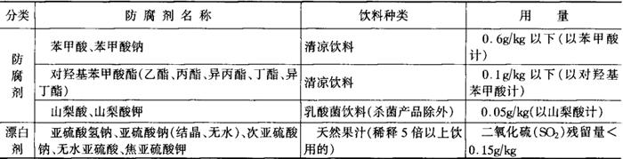 注:表中符号见表1-4-41注。 防腐剂按其来源可以分为有机和无机两类。有机防腐剂主要有苯甲酸及其盐类、山梨酸及其盐类、对羟基苯甲酸酯类和丙酸盐等。无机防腐剂有二氧化硫、亚硫酸盐等。按用途又可分为防腐剂和漂白剂。无机防腐剂兼有漂白剂作用。此外还有乳酸链球菌肽等肽类抗菌素。目前我国允许使用的防腐剂共28种。某些饮料为了提高其保藏性,往往需要使用防腐剂,但不同种类的饮料需要选择不同的防腐剂和合理的使用量。饮料中常用的防腐剂及使用标准可参考表1-4-56。 表1-4-56 饮料用防腐剂及其使用标准