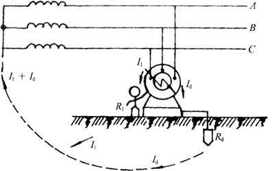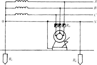 图2-6 保护接地作用原理图 2.保护接中线(保护接零) 380V/220V的低压三相四线制电网中性点一般都是接地的。采用中性点接地主要有两个原因:当有一相导线出现接地故障时,避免其他两相线的对地电压升高;同时还可以将中性线电位固定为零,防止中性线电压升高。对于这样的低压电网,为了防止电气设备金属外壳漏电引起人身触电,也可以采用保护接中线代替保护接地,即将电气设备上所有不带电的金属部分全部和接地中性线相连接,如图2-7所示。