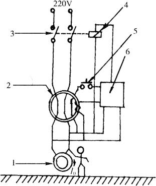 图2-8 漏电保护器原理图 1.用电器具 2.零序电流互感器 3.自动开关 4.脱扣线圈 5.试验按钮 6.电子电路 正常用电时,自动开关合上,220V电源通过火线和零线与用电器具接通,两根电线中流过的是同一个电流,一进一出,大小相等,方向相反。因此,穿过电流互感器的电流代数和为零,互感器磁路中的合成磁通也为零。磁路上的二次线圈中没有感应电势,脱扣线圈不动作,自动开关保持合闸状态。当人接触带有漏电电压的金属外壳时,漏电保护器的电子电路起动,于是电源与脱扣线圈之间的电路接通,自动开关跳闸。 (二)防止在电气设备上工作引起触电的基本措施 (1)在带电设备附近工作时,为了保证人身安全,必须与带电体保持一定的安全距离,见表2-12。 表2-12 人与带电体之间应保持的安全距离