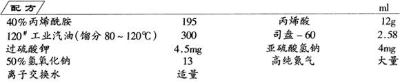 用20ml离子交换水冲稀12g经蒸馏提纯后的丙烯酸,冷却后用13ml 50%的氢氧化钠水溶液中和,并将此中和液与含有过硫酸钾4.5mg、亚硫酸氢钠4mg的195ml浓度40%的丙烯酰胺水溶液混合后,再加离子交换水调节到水相总体积为300ml。将上述水溶液倒入1000ml三颈烧瓶中,在烧瓶中事先加入300ml汽油、2.5g司盘-60,通高纯氮,消除反应系统的氧,并在搅拌下缓慢升温,在45~50℃引发,到70℃时保温1h,最后升温脱水,滤去汽油,将产品干燥,即得粉状阳离子型聚丙烯酰胺。
