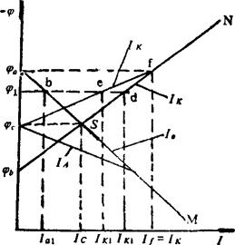 图3-6-19 牺牲阳极保护示意图(箭头表示电流方向) 1-腐蚀介质 2-牺牲阳极 3-绝缘垫 4-被保护设备 5-连接螺钉 6-屏蔽层 (二)阴极保护的基本原理 由图3-6-20可看出,将处于腐蚀区的金属A点和过钝化区的金属D点进行阴极极化,使其电位降低至热力学稳定状态B点和钝化区C点,金属腐蚀即停止。由图3-6-21看出,腐蚀金属微电池的阳极极化曲线φaM与阴极极化曲线φbN交点为S,对应的腐蚀电位,电流为φcIc,外加阴极电流使金属的总电位由φc极化至φ1。此时金属微电池阳极腐蚀电流为Ia1<Ic,即金属本身的腐蚀电流减小,因而得到保护;进一步极化,腐蚀体系总电位降至φa,则阳极腐蚀电流Ia为零,外加电流Ik=If,金属得到了完全保护,此时金属的电位称为最小保护电位。达到最小保护电位时金属所需的外加电流密度称为最小保护电流密度。