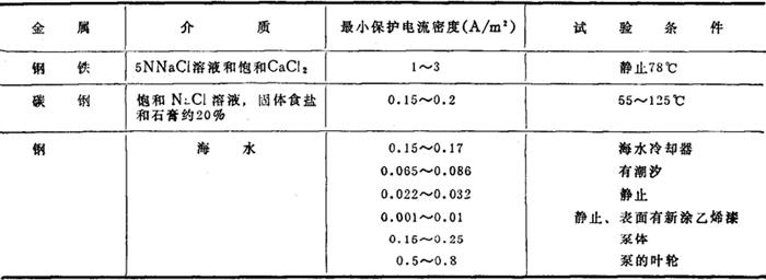 注:此表数据取自1973年8月英国标准研究所制定的阴极保护规范。 ①海水系指洁净、充气并未稀释的海水。 ②铝进行阳极保护时,电位不能太负,否则会加速腐蚀,产生负保护效应。 2.最小保护电流密度 使金属得到完全保护时所需的电流密度。在生产实践中,影响最小保护电流密度的因素较多,所以它在阴极保护中只起参考作用。 表3-6-20为钢铁在不同介质中阴极保护最小保护电流密度。 表3-6-20 钢铁在不同介质中阴极保护最小保护电流密度