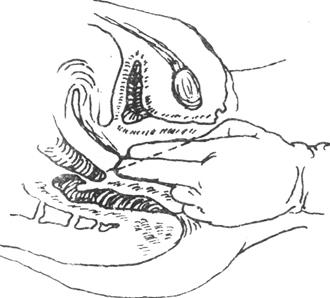 图5-3-1 阴道隔膜 阴道隔膜的使用效果与是否合用杀精子剂及是否有使用经验有关,正确使用的理论效果在95%以上。 一、适应证和禁忌证 1.适应证 最适用于有心、肝、肾等疾患不宜应用药物避孕和有内生殖道疾患不宜放置宫内节育器或手术绝育者,也适用于无禁忌证的任何育龄妇女。 2.禁忌证 (1)阴道过紧,无法放置者。 (2)阴道前壁过度松弛、子宫脱垂Ⅱ°以上者。 (3)阴道炎或宫颈重度糜烂者宜治疗后用。 (4)双阴道、阴道纵隔或横隔、双宫颈等畸形者。 (5)有便秘习惯者,需纠正后使用,因干结大便充满直肠,常使阴道隔膜不能放置到正确位置。 二、阴道隔膜配置法 (1)避孕妇女先排空膀胱。 (2)进行妇科检查,先窥视阴道及子宫颈情况(有异常者给予相应治疗)。双合诊检查了解子宫和子宫颈的位置、大小。以食、中二指测量自后穹窿到耻骨联合后缘的距离(即自中指顶端到耻骨联合后缘的斜径),见图5-3-2。