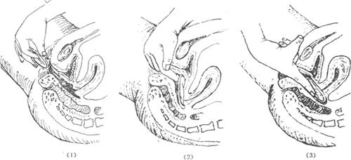 图5-3-4 (1)将隔膜沿阴道后壁放入;(2)将隔膜前缘推向耻骨联合后方;(3)食指探摸子宫颈是否盖住