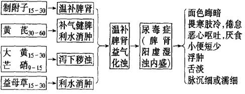 【要点】 本方由《金匮要略》大黄附子汤化裁而来。原方是治寒积便秘,胁下偏痛,故用大黄、附子配细辛;本方是治阳虚水肿,故用大黄、附子配黄芪、益母草。 【应用】 1.慢性肾脏疾病晚期。 2.各种原因引起的尿毒症。 3.肝硬化腹水。 【注意】 本方为脾肾阳虚,湿浊内盛的尿毒症而设,若湿热内盛者不宜使用本方。 【类方】 1.益肾汤(《新医药杂志》):由当归、赤芍、川芎、红花、丹参、桃仁、益母草、金银花、白茅根、板蓝根、紫花地丁组成。功能祛瘀消肿,清热解毒。主治阳损及阴、瘀热交蒸之水肿、小便不利。 2.天真丹(《卫生鸿宝》):由巴戟天、补骨脂、葫芦巴、杜仲、桂心、沉香、小茴香、琥珀、萆薢、黑牵牛组成。功能温阳利水,消肿除胀。主治下焦阳虚肿胀。 3.黄芪益肾汤(《浙江中医杂志》):由黄芪、鱼腥草、白花蛇舌草、地龙、益母草、丹参、蝉衣、银花、猪肾等组成。功能益气培本,清热解毒,活血化瘀。主治肺脾肾俱虚,热毒瘀血滞留之水肿,神疲,喘促等症。 4.实脾饮(《重订严氏济生方》):由厚朴、白术、木瓜、木香、草果仁、大腹皮、附子、茯苓、干姜、甘草组成。功能温阳健脾,行气利水。主治阳虚水肿,尿少便溏等症。 5.真武汤(《伤寒论》):由茯苓、芍药、白术、生姜、炮附子组成。功能温阳利水。主治脾肾阳虚,水湿内停之证。 6.温肾排毒汤(《新中医》):由炮附子、姜半夏、大黄、黄连、党参、白术、紫苏、六月雪、绿豆、甘草组成。功能温补脾肾,排毒泻浊。用于慢性肾功能不全、尿毒症等。 |