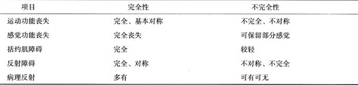 | 释义 | 陈旧性脊髓损伤的诊断 与急性脊髓损伤的诊断相比,陈旧性脊髓损伤更强调神经系统的体格检查,而影像学检查、电生理检查对明确脊柱脊髓的形态结构及脊髓神经的功能,指导临床治疗及预后有更重要的意义。 一、体格检查 详细的全身各系统的体格检查是十分必要的。要注意有无体温、体表皮肤、呼吸系统、泌尿系统等常见的陈旧性脊髓损伤并发症发生。而神经系统的检查尤为重要。 当瘫痪病人就诊时,要判断其脊髓损伤是完全性还是不完全性的,对治疗和评估预后有指导作用。脊髓完全横断后,受损平面以下运动、感觉和反射全部消失。如神经功能恢复为一个脊髓节段以上时,可判断为不完全损伤。完全性和不完全性脊髓损伤的鉴别如表11-1所示。 表11-1 完全性和不完全性脊髓损伤的鉴别