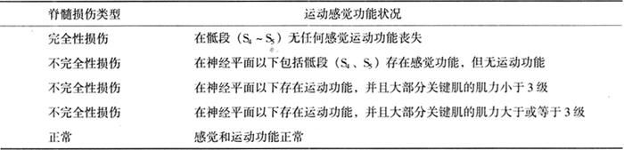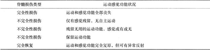 有关脊髓损伤的分类方法常用的有Frankel功能分类法和美国脊髓损伤协会(ASIA)分类法,均已被广泛应用于临床及科研工作中,详见表11-2、表11-3。 表11-2 Frankel功能分类法
