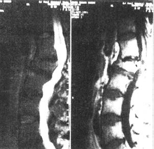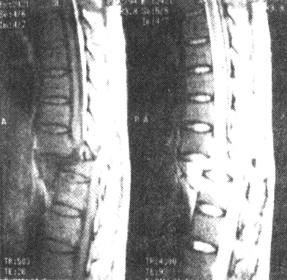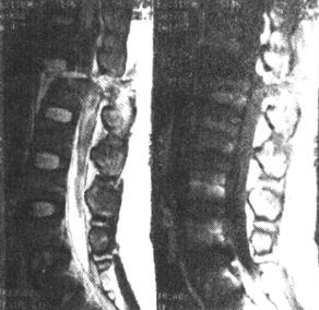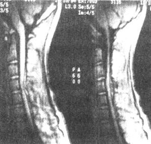 通过以上检查,首先明确患者为完全性还是不完全性脊髓损伤,再通过功能分类判断脊髓损伤的恢复情况。在不完全性脊髓损伤中,要明确感觉平面和运动平面恢复情况是否一致;如不一致,要明确哪种恢复较好,感觉和运动平面相差几个神经节段,从而判断脊髓损伤或受压迫的平面及部位。根据脊髓解剖可推知,感觉恢复好者表明脊髓前方可能存在压迫;反之,运动恢复好者,压迫来自脊髓后方。恢复相差节段越多,可提示减压术后预后越好。不完全损伤的病例中,若初始阶段恢复明显,而后停顿,常提示有妨碍恢复的因素存在,如压迫等,再行减压术可能获得良好效果。 在完全性脊髓损伤中需明确感觉运动平面是否一致及截瘫平面与骨折平面是否一致,以判断是否混有根性损伤。神经根压迫性损伤在解除压迫后可能获得进一步恢复。 马尾神经损伤多为不完全性损伤,且已属周围神经范畴。解除压迫或吻合修复常有一定的功能恢复。 二、X线检查 常规X线平片作为脊柱损伤的基本检查手段,其优点为价格低廉、诊断快捷准确,椎体及附件骨折、脱位或半脱位在X线平片上多能明确显示。一般爆裂骨折在正位平片上显示椎体宽度增加,高度缩小,椎体侧弯,椎弓根间距增宽或椎弓根变形,边缘不规则,一侧椎体边缘呈粉碎性骨折,周围有碎骨片,骨折线较急性期模糊或消失,小骨碎片吸收或已愈合。侧位片上见椎体明显后突畸形,棘突间距增宽,椎体可见纵或横形骨折线或明显楔形变,椎体后缘线的后移、旋转或消失是诊断后缘终板骨折的有力证据;椎体后缘不连续,断裂,后缘成角且骨块后移突入椎管,椎体后缘密度减低,所以异常的后缘线说明碎骨片后突压迫椎管,影响椎管通畅。 但X线检查对观察骨折的细节、椎管受累的程度等方面还存在一定的限度。X线平片软组织分辨率低,无法观察脊髓及软组织损伤、神经受压程度等,给临床治疗带来一定困难,此种情况下,需行CT或MRI检查。 三、CT与MRI检查 (一)CT检查 CT诊断脊椎骨折明显优越于平片。CT能显示终板的粉碎性骨折和椎体前后方向的纵行骨折。椎板骨折线通常靠近与棘突底部交界处,小关节脱位和骨折分离以及横形贯穿骨折提示脊柱损伤的旋转外力。CT可清晰地显示突出的骨碎片对椎管的压迫程度,初步评价椎管狭窄及脊髓受压的情况。在二维和三维CT重建中可更为清晰地显示骨折、骨块、脱位及椎管情况,为临床诊断和制定手术方案提供有力的参考。 CT扫描和MRI对脊椎骨折检查有互补作用。CT能显示终板的粉碎性骨折和椎体前后方向的纵行骨折。椎板骨折通常靠近与棘突底部交界处,CT可清晰显示突出的骨碎片对椎管的压迫程度。CT扫描显示椎弓根、横突骨折及椎骨碎骨块后突较MRI清楚。MRI可显示CT所见到的骨折,但椎弓根及横突骨折不结合CT观察则容易遗漏。CT未能显示脊髓本身病变,而MRI能直接显示脊髓损伤的各种病理改变是其最大的优点,尤其是对后柱稳定的脊椎骨折,MRI亦能显示CT不能显示的脊髓损伤;显示其他软组织损伤的能力MRI亦较CT强。因此,CT及MRI的联合使用,对陈旧性脊椎骨折脊髓损伤的判断有互补作用。 (二)MRI检查 MRI显示脊柱骨折不如CT直观、准确(显微骨折除外),因为它的图像显示骨折线因发生的部位和病理演变过程不同而在不同部位和各个时间表现不一,但均取决于毗邻松质骨或皮质骨的信号强度,可表现为明亮或暗淡的线样结构。皮质骨内骨折线容易认识,边界清晰锐利,几乎与CT相似;松质骨内骨折线由于椎体碎裂信号强度不均匀而表现为模糊不清的阴影,显示不理想。对附件骨折的发现MRI亦不如CT,胸腰段脊柱附件在周围韧带、脂肪、肌肉的衬托下,MRI显示骨折相对容易,颈段附件因本身骨结构体积较小,且无良好周围衬托,如无CT作比较,横切面MRI图像则难以显示骨折。但脊柱仅有显微骨折时,MRI却可以根据其早期椎体松质骨内充血的低信号影及前或后纵韧带下的高信号血肿影来明确诊断。 MRI的矢状面像清楚地显示脊柱序列,能敏感直观地发现脊柱脱位、半脱位、椎间小关节脱位或绞锁;且能直接表现脊柱各支持韧带的完整性。而这些韧带结构完整与否对脊柱稳定起重要作用,因此MRI十分有助于脊柱稳定性的估价。而CT矢状重建图像质量较差,空间分辨率不高,难免遗漏脊柱半脱位;且它不能显示韧带结构,对脊柱潜在力学上不稳定只能作间接推测。 胥少汀对60例陈旧性脊髓损伤的MRI表现作了分析,并将其总结为以下7型:①脊髓与硬膜横断型。伤段脊髓与硬膜囊连续中断。在T1加权成像见脊髓断裂,断端萎缩呈低信号;T2加权像硬膜囊呈两个盲端,在横断面上脊髓信号消失(图11-1)。②脊髓萎缩型。T1加权成像脊髓信号明显变细长达数个脊椎节段,横断面脊髓信号仅占椎管前后径的1/3(图11-2)。③脊髓结构严重紊乱(变性)型。T1加权成像脊髓伤处信号低,斑点不匀;T2加权成像高信号(白),横断面上脊髓信号不清(图11-3)。④脊髓受压型。由于椎骨或椎间盘压迫脊髓变形,T1及T2加权成像上脊髓本身信号无明显改变(图11-4)。⑤脊髓囊腔型。T1加权成像上脊髓内有椭圆形或长条形低信号区,大小不等;T2加权成像为高信号,横断面脊髓内有中空囊腔。⑥脊髓结构轻度紊乱型。T1加权成像伤区信号略低;T2加权成像上信号不匀,斑点状。横断面脊髓信号不匀。⑦马尾紊乱型。T1加权成像马尾走行紊乱,不匀,混有长条或圆