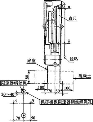 将限速器放在底座上,放置时应注意限速器的方向,必须使限速器的工作方向与电梯的运行方向一致。用螺栓将限速器固定在底座上,稍微紧固。使用线坠测量限速器绳轮的垂直度,要求如图8.3-1中的a、b两点的偏差小于0.5mm,然后紧固安装螺栓。