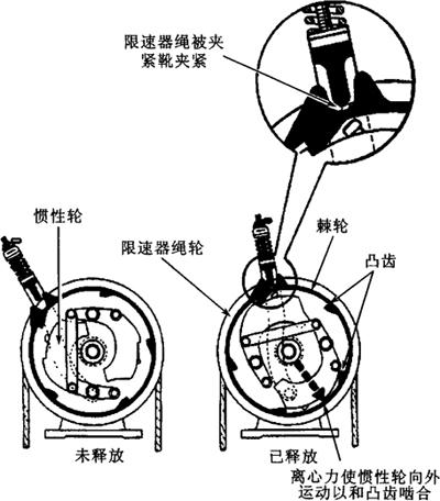 图13.4-1 限速器结构 1-触点 2-绳轮轴(旧的末端还有油孔和定位螺丝的凹槽) 3-弹簧压力开关 4-弹簧触点 5-开关 (一)限速器按结构分类 根据限速器的结构和工作方式不同,限速器可以细分为下面几种: 1.盘式限速器 也称甩块式限速器,是离心式限速器的一种。甩块与限速器轮处于同一垂直平面内旋转。甩块在离心力作用下外移,超速开关动作使曳引电动机断电制动。若轿厢继续加速(指下降运行),则夹绳器夹住限速器钢丝绳,带动轿厢安全钳或对重安全钳动作。 2.甩球式限速器 是离心式限速器的一种,广泛用于高速电梯。伞齿轮带动限速器滑轮旋转,转换成垂直轴旋转,依靠垂直轴顶部连杆机构所挂摆锤的离心力动作。结构较复杂,但检测精度较高。 3.摆锤式限速器 也称凸轮式限速器、惯性振动式限速器,是限速器的一种,属非连续捕捉型限速器。常用的有5星和8星凸轮式。依靠与绳轮同步旋转的凸轮带动由弹簧施力复位的摆锤摆动,若速度达到限定值时摆锤另一端棘爪插入棘轮而锁住限速器绳轮。结构简单,体积小,重量轻,但弹簧易疲劳,动作速度不准确,仅适用于低速电梯。 4.夹绳式限速器 是限速器的一种。动作时夹绳机构夹住限速器绳,提拉安全钳。分压绳舌压轮式和钳块式,其夹绳部分都是自锁的。 5.偏心叉锤型离心式限速器 是夹绳式限速器的一种,属压绳舌压轮式。动作后偏心叉会被转动,安装其上的压绳舌在偏心叉转过一个角度后将绳压紧在限速器轮槽中,夹绳力较大。 6.曳引提拉式限速器 是限速器的一种。无夹绳装置。限速器绳提拉安全钳的力依靠限速器绳与绳轮的摩擦,当限速器绳拉力足够大时,绳会克服其与轮的静摩擦而产生滑移,这与曳引机驱动电梯安全运行的原理相同,故有曳引式之称。 7.连续捕捉型限速器 限速器的一种,属离心式。限速器按速度可随时触发,电梯在任何时刻达到限定速度时限速器即动作而提拉安全钳。不存在因动作间隔而使电梯加速造成安全钳动作需加大能量的危险。 8.非连续捕捉型限速器 即“摆锤式限速器”。当电梯超速达到限速器动作速度时,限速器的转动检速部分仅能在圆周上几个特定的点位动作而制停限速器绳提拉安全钳。动作不稳定,有可能出现超速。 9.双向限速器 电梯超速保护装置。与双向安全钳配套组成升、降双向安全钳保护系统。能上、下双向触发、双向夹绳。由触发机构、夹绳机构、涨紧装置等组成。 10.正弦绳轮限速器 是一种摆锤式限速器,分上摆式和下摆式。属无夹绳装置的非连续捕捉型。设计的理论依据是具有粘性阻尼受迫振动中的共振现象。 限速器作为电梯中重要的安全设备,在保养维护时,应注意以下问题: (1)限速器动作速度。 (2)限速器绳的预张紧力。 (3)限速器绳在绳轮中的附着力或限速器在动作时的张紧力。 (4)限速器动作的响应时间应尽量短。 (二)限速器工作原理 限速器一般都是采用旋转离心力的原理工作。限速器采用安装在限速器绳轮的中心轴上的惯性轮。当轿箱运行时,限速器绳带动限速器轮旋转,产生的离心力使惯性轮向外转动。如果轿厢超速运行,惯性轮继续向外旋转,直到其与棘轮上的凸齿啮合,然后使棘轮作部分的旋转。当棘轮旋转时,其外缘的凸齿与制动叉相啮合,转动制动叉,使夹紧靴贴紧限速器绳,使限速器绳停止跟随轿厢运行,进而使安装在轿厢上的连动装置安全钳动作,停止轿厢在导轨上。 在限速器机械装置动作的同时,限速器上的连动装置还同时切断限速器开关(电气开关),使电梯电机停止运行,防止电梯轿厢停止后电动机还在运行。 限速器工作原理如图13.4-2所示。