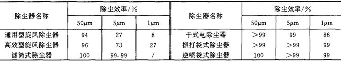 式中g1——除尘器入口气体的含尘浓度,mg/m3; g2——除尘器出口气体的含尘浓度,mg/m3。 当采用两级除尘时,两级除尘效率η1-2: η1-2=η1+(1—η1)·η2 式中η1、η2——第一、二级除尘器的除尘效率,%。 除尘器的除尘效率与粉尘的粒径分布有关,故用分级效率表明除尘器的分离性能。表10-4-12列出几种除尘器时50μm、5μm、1μm粒径下的除尘效率,可供选用除尘器时参考。 表10-4-12 各种除尘器在不同粒径下的概略效率