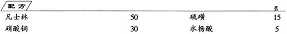 先将硝酸铜与硫磺研成粉末,然后与其余原料混合,并搅拌均匀,即成产品。