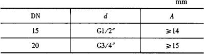 按表6-84中规定,用冷水进行试验和用空气在水中进行试验是等效的。 3)流量。 ①在动态压力为0.3MPa±0.02MPa水压下,浴盆水嘴(不带附件)流量不小于0.33L/s,面盆、洗涤等其他水嘴(不带附件)流量不小于0.20L/s。 ②面盆、洗涤及厨房水嘴(带附件)在动态压力为0.1MPa±0.01MPa水压下,流量不大于0.15L/s。 4)水嘴寿命。 ①单柄双控水嘴开关寿命试验达到7×104周期,单柄单控和双柄双控水嘴开关寿命试验达到2×105次后,应符合2)的要求。 ②转换开关寿命试验达到3×104次后,应符合2)的要求。 ③旋转式出水管寿命试验达到8×104次后,应符合2)的要求。 ④水嘴多冷热疲劳试验后,应符合2)的要求。 4.规格尺寸 1)单柄单控陶瓷片密封普通水嘴规格尺寸应符合图6-9要求。