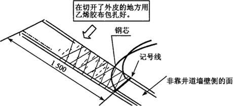 图11.5-2 随行电缆固定示意2 (二)钢芯电缆固定 如图11.5-3所示,首先确认随行电缆没有扭曲打折,然后将固定位置的电缆向上端长度约1500mm的距离画上标记,使用裁纸刀割开电缆外皮并拉出钢芯。