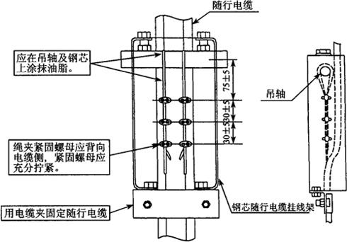 图11.5-3 随行电缆固定示意3 将切开部分用胶布重新包扎好,然后将钢芯如图11.5-4所示用钢丝夹固定在随行电缆挂线架上,并给钢丝和钢丝夹涂抹上油脂。