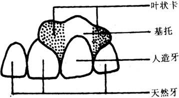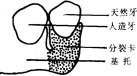 图31-11 叶状卡示意图 (4)分裂卡。可视为环卡的变异。在卡环与基托之间形成一与基牙长度相当的裂隙(卡环与基托部分不连接),适用于颊、舌向倾斜较大的基牙。当义齿戴入,卡环通过基牙时,卡环与基托分裂开,义齿就位后,卡环恢复原状(图31-12)。