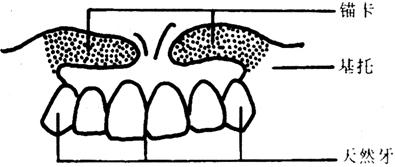 图31-12 分裂卡示意图 (5)锚卡。该卡环适用于牙槽嵴有明显倒凹而义齿难以就位者。当前牙区牙槽嵴或上颌结节区牙槽嵴过分突起时,可将牙槽嵴突起处基托去除,在其根方牙槽嵴倒凹区形成一锚状基托,即锚卡又称做指卡(图31-13)。