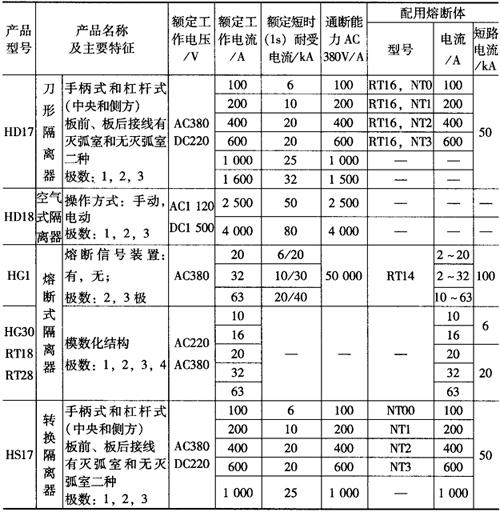 | 释义 | 隔离器 1.适用范围 适用于交流50Hz、额定工作电压至交流380V、直流至220V,约定发热电流至1600A的工业企业的配电设备中作为电源隔离之用。 (1)HD17刀形隔离器约定发热电流至1600A,主要用于企业的配电设备中作为电源隔离之用。带灭弧室的产品在规定的条件下,可用来接通或分断交流电路。 (2)HD18系列空气式隔离器约定发热电流至4000A,作为无载操作和隔离电源之用。 (3)HG1系列熔断式隔离器约定发热电流至63A,具有高短路电流配电回路和电动机回路中作为电源隔离器,并作为电路保护之用。 (4)HG30系列模数化熔断式隔离器约定发热电流至63A,适用于照明和动力线路中作为线路过载和短路保护之用。 (5)HS17转换隔离器约定发热电流至1000A,主要用于企业的配电设备中作为电源隔离之用。带灭弧室的产品在规定的条件下,可用来接通或分断交流电路。 2.常用隔离器产品型号及主要技术参数 常用隔离器产品型号及主要技术参数见表1-18。 表1-18 常用隔离器产品型号及主要技术参数