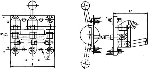 图1-10 HS17中央正面杠杆操作式外形及安装尺寸 表1-22 HS17中央正面杠杆操作式外形及安装尺寸/mm