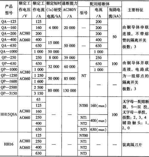 图1-11 模数化隔离开关外形及安装尺寸 2.隔离开关熔断器组 适用于具有高短路电流、低功率的供配电电路中,作为手动、不频繁操作的主开关,尤其适用于安装在较高级的抽出式低压成套装置中。国产型号为QA、QP和QSA系列的隔离开关是引进丹麦LK-NES公司的技术。 3.主要技术参数 常用隔离器产品型号及主要技术参数见表1-23。 表1-23 常用隔离开关产品型号及主要技术参数