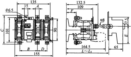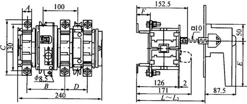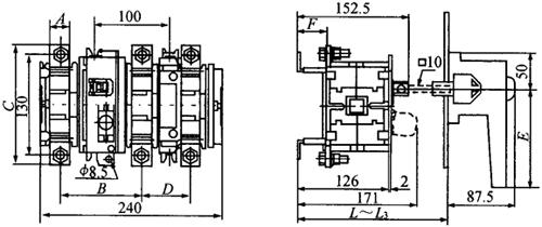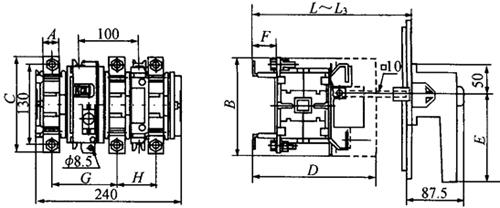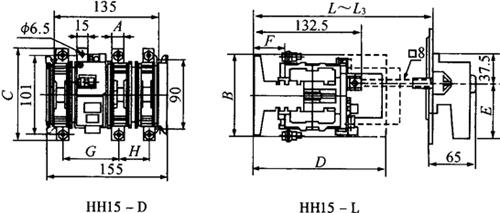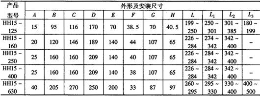 注:L为轴的长度,用户可按不同安装深度选择L1或L2或L3或L。 (2)HH15A(QA)系列隔离开关外形及安装尺寸见图1-13和表1-25。