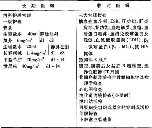 说明:(1)本化疗方案为治疗HD的标准方案之一,即MOPP方案;亦可用环磷酰胺(CTX)600~800mg/m2代替氮芥,则为COPP方案。该方案用药两周、休息两周为一疗程,推荐使用6个疗程,或达完全缓解(CR)后再加2疗程;另一有效的方案为ABVD方案,即阿霉素、搏来霉素、长春碱和甲氮咪胺。 (2)化疗药物静脉注射时要严防漏出血管外,用药后要继续点滴液体以冲刷血管。使用CTX时,要注意补足液体以保证足够尿量,防止出血性膀胱炎。化疗期间,尤其在肿瘤负荷高时,应注意防止尿酸性肾病。 (3)HD的治疗方案选择与病变分期、病理类型及不佳预后因素有密切相关,基本原则为IA和部分IIA期病变采用次全淋巴结照射(STNI);IB和部分IIA期病变采用联合治疗方式,即化疗+STNI或局部照射;Ⅲ和IV期病变以联合化疗为主,必要时局部化疗。 (4)对复发的HD患者,应根据既往治疗情况、复发时间及病变程度选择MOPP方案或新的化疗方案,或大剂量放疗、化疗联合自身造血干细胞移植治疗。 |