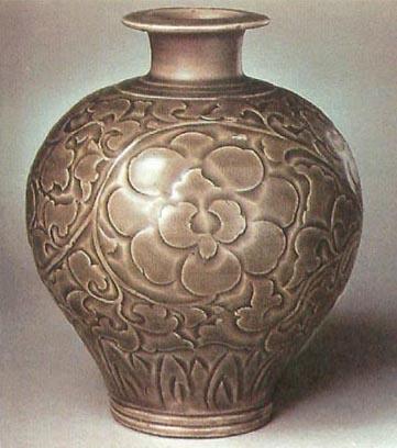 25.耀州窑青釉刻花瓶 北宋 耀州窑虽属民间瓷窑,但制作非常规整,釉色很漂亮。据史书记载,北宋中晚期的耀州窑有大量上乘之作做为贡瓷供宫廷使用。 4.临汝窑 窑址在河南省临汝县严和店。临汝县窑址很多,宋代主要烧三个品种:一是汝官窑,专供宫廷用瓷(见汝窑);二是烧钧窑瓷系的瓷器;三是烧耀州窑系青瓷。烧青瓷的窑址以严和店为代表。烧造年代始于北宋中期,盛于北宋后期,直到金代。 北宋临汝窑青瓷以盘、碗、灯为主,瓶、罐、枕等少见。胎子粗厚但较坚致,旋削草率,不规整;施釉略厚,青绿色,釉中含气泡较多。器物多光素无纹,也有印花的,刻花极少见。纹饰不清晰,艺术效果较差。纹饰轮廓多阳文凸起,而花瓣、叶筋却是阴文凹下。常见纹饰有:水波游鱼、水波纹(布局较独特,为圆圈纹,中心有时饰花朵,叫落花流水,还有的饰田螺)、缠枝花卉、折枝花卉,以缠枝菊最为常见,也有团菊和菊瓣纹,有的团菊中间无蕊,内印“童”、“吴”等字,应是工匠或窑主的姓氏。 耀州窑青瓷与临汝窑青瓷和北宋龙泉青瓷的特征比较接近,初学者很难分清,它们之间的区别在于:①耀州青瓷胎子坚致细密、较薄,修胎精细,釉子光润,青中闪黄,刻花用刀较深,纹饰犀利流畅,印花清晰规整;②临汝窑青瓷胎子略厚,修胎草率,釉子稍厚、葱绿色,有气泡,刻花极少,印花纹饰不清晰比较模糊;③北宋龙泉窑青瓷釉色和耀州青瓷近似,都是青中闪黄,但闪黄程度略小,不像耀州青瓷呈姜黄色,常见刻花及划花纹饰,但纹饰较满略碎,不如耀州青瓷那样犀利粗犷。 5.广州西村窑 窑址在广州市。主要品种有白釉、青釉、黑釉、青白釉彩绘等。其中青釉瓷和耀州窑青瓷极为相似,但胎子略粗,不很精细;釉色青绿,纹饰刻法呆板。印花瓷和耀州窑比几乎看不出区别。西村窑遗址出土的遗物在国内几乎不见,在东南亚地区却大量发现,可见西村窑是宋代专门生产外销瓷器的瓷窑。 除了以上几个窑外,河南的宝丰窑、禹县钧台窑、广西的永福窑等都烧造耀州系青瓷器。 |