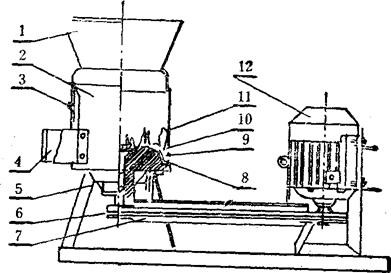 1.加料斗;2.桶身;3.控制门;4.出料口;5.机架;6.三角皮带;7.防护罩;8.侧尖刀;9.定尖刀;10.圆转盘;11.动尖刀;12.电动机