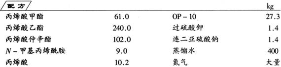 将余下的混和酯单体液在3h内缓缓加入釜中。并另取20L4%过硫酸钾溶液及20L4%连二亚硫酸钠溶液分批加入釜中,物料全部加完后,再继续反应1h左右,出料,包装,即为成品。
