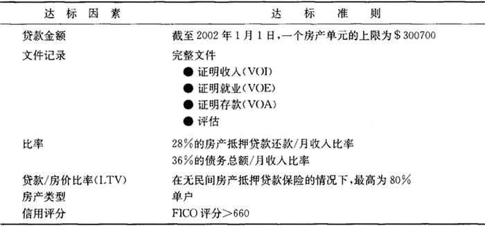 | 释义 | 非联邦机构MBS和房地产支持ABS 在第十四章中,我们描述了吉尼·美、凡尼·美和弗莱迪·麦克发行的房产抵押贷款证券。在本章中,我们将考察非由这些主体之一发行的住宅抵押贷款支持产品。这些产品被分为两个群体:非联邦机构MBS和由住宅抵押贷款支持的资产支持证券(即房地产支持ABS)。 证券归属于非联邦机构MBS还是房地产支持ABS并非总是清晰的。这是由于一些证券的基础抵押物是与各种类型的房产抵押贷款混合在一起的。也就是说,支持一笔证券的抵押物可能会包含标准的第一抵押权住宅抵押贷款、第二抵押权住房抵押贷款以及我们将在本章中描述的其他产品——住宅产权贷款和制造式住宅贷款——的组合。(1)证券数据公司(Securities Data Corporation,SDC)已为将具有混合抵押物的房产抵押贷款产品分类为非联邦机构MBS还是ABS制定了标准。分类规则如下:假如在发行时,证券的50%以上是由制造式住宅贷款、住宅产权贷款、二次房产抵押贷款或住宅装修贷款组成的,那么证券被归类为ABS。对于50%以上的贷款为第一抵押权的证券而言,SDC利用一个规模检验为证券分类。假如本金总额超过50%的贷款拥有$20万以上的贷款余额,那么证券被归类为非联邦机构MBS。50%的贷款为第一抵押权、但本金总额超过50%的贷款小于$20万的证券被归类为ABS。 住宅房地产支持证券的抵押物 用作联邦机构证券抵押物的房产抵押贷款为达标贷款。也就是说,它们必须符合联邦机构的承购标准。表15.1提供了传统的联邦机构贷款准则——贷款金额、文件记录、贷款/房价比率、房产类型和信用评分。信用评分是申请人还贷能力的测度,本章后面将讨论这点。 表15.1 传统的联邦机构贷款准则