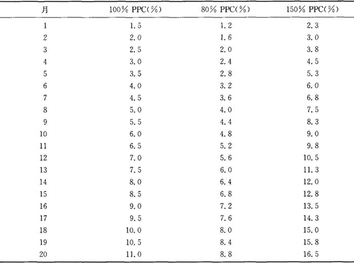 根据标准普尔的统计,75%的美国人口拥有660分以上的信用评分,而仅有25%的人口的信用评分低于660。 提前还款惯例 房地产支持证券的承销商和做市商已为这些贷款开发了提前还款模型。数家公司已发现,非达标房产抵押贷款与达标房产抵押贷款的借款人之提前还款行为的主要区别在于借款人的信用特征所扮演的重要角色。 我们在试图评估特定证券的提前还款时,必须考虑借款人的特征和老化过程。发行说明书提供了一个基础情形中的提前还款假设——初始速度和抵押物老化所需要的时间。因此,提前还款基准是因发行者而异的。发行说明书中的基准速度被称为发行说明书提前还款曲线(prospectus prepayment curve)或PPC。与第十四章描述的PSA基准相同,更慢或更快的提前还款速度是PPC的一个倍数。例如,一笔特定的非联邦机构证券的PPC也许会表述如下: ……100%的提前还款假设假定在贷款期限内,第一个月的未偿房产抵押贷款本金余额的年条件提前还款率为1.5%,并在接下来的每个月递增0.5%/年,直至第20个月。从第20个月开始,100%的提前还款假设假定每个月的条件提前还款率为11%/年。 对于这种证券,前20个月的100%PPC、80%PPC和150%PPC将为如下所示: