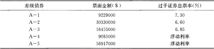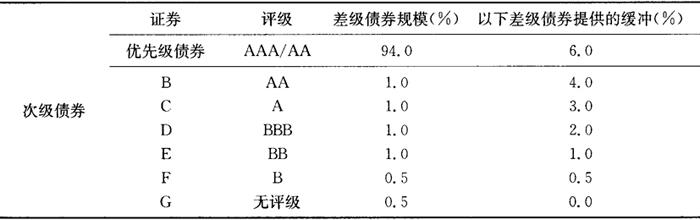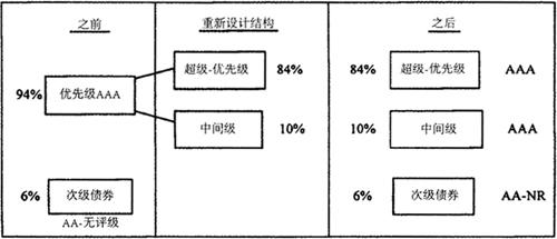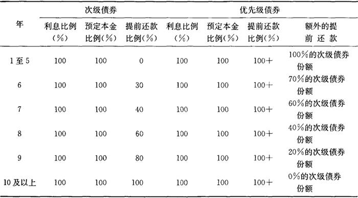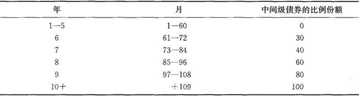 图15.3 创建超级-优先级债券 超级-优先级债券是通过将优先级债券分割为两个部分创建的:超级-优先级债券和中间级债券。尽管中间级债券享有AAA评级,但它们在损失分配的优先次序上次后于其他AAA级债券。 然而,AAA中间级债券确实享有与结构中的次级债券相同的严格封锁特征。也就是说,在前5年内,抵押物池的100%的非预定本金还款(即提前还款)被用于偿付优先级债券(见表15.8)。然而,与传统的次级债券不同,并非所有的中间级债券都必须通过损失和逾期启动检验才能开始按比例获得其非预定本金还款的份额。 表15.8 中间级债券的提前还款分配计划