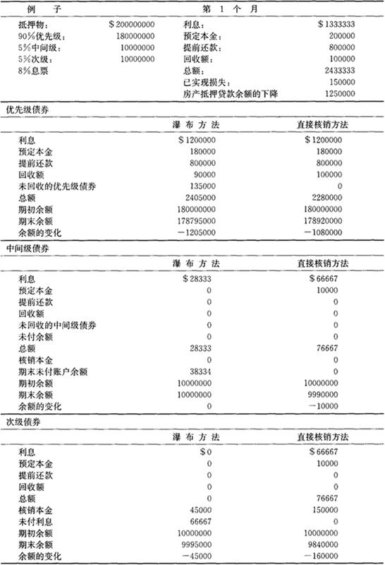 在转换利益结构中,次级债券并非对特定金额的现金流拥有索偿权,而是对一部分基础资产拥有索偿权。已实现的损失全被用以降低档次最低的次级债券的未偿余额。因此,损失将降低最先损失差级债券的余额,直至其本金余额被耗尽为止。接着,下一档评级最低的差级债券将会消化损失,依此类推。 损失的分配方法 优先/次级结构中的损失将被最次级的差级债券吸收,尽管交易结构中的现金流的发生时间和分配可能会有所不同。优先/次级结构有两个传统的损失分配方法:(1)瀑布方法,以及(2)直接核销方法。表15.4显示了这两个方法的区别。 表15.4 瀑布方法与直接核销方法的比较