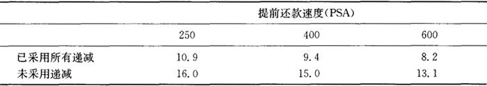 我们应指出这两个方法的数个不同之处。首先,在瀑布方法中,多档债券的次级结构可能会随着利息付款的累计受到不利影响。例如,在表15.4给出的例子中,中间级债券仅获得了其预定的$67667利息付款中的$28333,从而产生了一个必须在未来被加以偿还的缺额。假如信用问题持续存在,那么未付利息可能会累积数月而没有任何现金流。这个因以现金支付优先级债券应承担的损失而产生的问题可能会严重影响处于应计状态的差级债券的流动性。(3) 在直接核销方法中,优先级债券有权获得房产的清算收入,并且所有损失都在最次级的债券中核销。此外,所有利息和预定本金都是按比例分配的。 证券启动事件 我们在分析优先/次级债券时需要考虑的一个重要成分是证券的“启动事件”。启动事件是允许次级债券占证券总额的比例下降的递减检验。例如,正如表15.5显示的那样,标准优先/次级结构中的次级债券在前5年内被封锁在非预定还款(提前还款)以外。在这段封锁期后,提前还款保护逐渐“递减”,直至次级债券在第10年按比例获得其全部的提前还款份额为止。 表15.5 不同提前还款速度和递减情况下的平均期限*