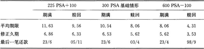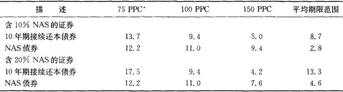 NAS债券的描述 由于NAS债券的还款计划,其平均期限特征将比同一证券结构中具有类似久期的接续还本债券更为稳定。表15.10显示了两个非常规A级贷款(Alt-A)证券结构的平均期限特征,其中一个结构含10%的NAS,另一个结构含20%的NAS。正如先前显示的那样,NAS占证券结构的比例越低,结构中所有债券的平均期限特征就越为稳定。此外,NAS债券的现金流波动性比具有类似久期的接续还本债券显着更低。这种更低的现金流平均期限波动性使NAS债券的期权成本更低。 表15.10 NAS平均期限的比较