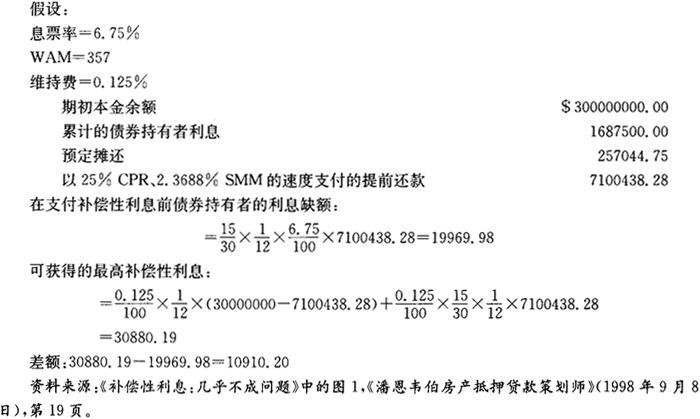 尽管大多数证券都利用10%的清理赎回权,但这不一定意味着这些证券将被赎回。许多证券未被赎回的原因包括: 1.计算机技术的发展使维持商能够继续经济地维持为贷款池提供服务的功能。 2.逆向选择(贷款池中的最后数笔贷款可能是信用资质最差的)可能会阻碍这些贷款的回购。 3.贷款池的发行者通常通过控制服务功能和/或持有IO差级债券保留贷款池的经济利益。 补偿性利息 非联邦机构MBS独有的一个特征是补偿性利息。MBS每月支付本金和利息。尽管业主可能会在月内的任何一天提前偿还其房产抵押贷款,但联邦机构会保证向投资者支付整个月的利息,就像所有提前还款都在当月的最后一日发生的那样。这种担保不适用于非联邦机构MBS。假如业主在月内的第10天清偿房产抵押贷款,那么他不必为当月的剩余天数支付利息。由于支付的延迟(如25天),投资者将在下一个月的第25日获得全部本金,但仅获得10天的利息。 这个现象被称为还款利息缺额或补偿性利息,不同发行者对其的处理方式也各有不同。一些发行者最高仅支付一定的金额,另一些则不支付任何补偿性利息。事实上,支付补偿性利息的主体是维持商。维持商从维持费利差中获得利息的缺额。向投资者补偿的缺额仅限于全部或部分维持费利差。因此,尽管投资者拥有防止损失全月利息的保护,但这种保护可能是有限的。 在过去数年中,发行者的补偿性利息政策已发生了急剧变化。尽管一些发行者曾一度不提供任何补偿性利息,但如今,非联邦机构证券的主要发行者的补偿性利息政策都至少提供12.5个基点的补偿性利息。投资者应当注意补偿性利息政策的三个方面:(1)最高补偿性利息,(2)其所覆盖的提前还款的类型——全额提前还款和部分提前还款,以及(3)提前还款的划付周期。 表15.7提供了一个如何计算最高补偿性利息和确定补偿额的例子。这个例子假设发行者将最高支付相当于每年12.5个基点的补偿性利息。基于表中的假设,最高补偿性利息为$30880.19。基于这些假设的利息缺额为$1996968。由于可获得的最高补偿性利息高于利息缺额,利息缺额将得到补偿。 表15.7 补偿性利息的计算举例