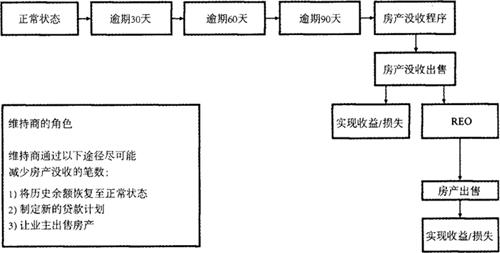 损失是如何发生的? 次级债券的投资者必须理解损失是如何发生的。正如图15.1中的流程图显示的那样,在贷款池的损失发生前,贷款必须从其正常状态经历逾期30天、60天和90天的状态,然后最终进入房产没收程序。在这个过程中,维持商履行了十分重要的功能。