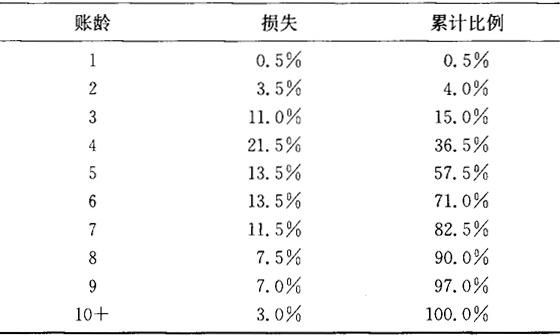 图15.1 损失发生方式的流程图 我们应该指出,维持商通常会在直至房产没收的整个期间向债券持有者预付(本金和利息)。维持商将在计算贷款池的任何损失前,支付这些将在房产清算时得以回收的预付款。 维持商还会尽力防止债券持有者蒙受损失。一旦贷款逾期后,维持商将通过以下途径尽可能减小损失: 1.联系借款人并希望将贷款余额恢复至正常状态。 2.为借款人提供一个新的贷款计划(以将贷款余额恢复至正常状态)。 3.鼓励拥有权益的业主出售房产。 假如这些策略中的任何一种获得成功,那么维持商就会防止逾期贷款导致贷款池的损失。 防止贷款池损失对次级债券产生负面影响的最佳防御是业主在房产中的权益。也就是说,业主的首付款或在特定房产中的实际权益是防止违约的第一道防线。只有当负权益的情况存在时,违约才会合理地发生。否则,业主将会出售房产以防止违约。 对处于负权益情形中的业主的经验研究显示,只有一小部分这种贷款会发生违约。统计数据显示,我们需要一段借款人经受严重压力的时期(即离婚或失业)再加上负权益状况才会导致严重的违约程度。由于以下原因,房产抵押贷款借款人在大多数负权益情形中防止了违约:(1)失去住宅的社会耻辱感,(2)对玷污信用评级的担心,以及(3)对住房的现有需求。此外,由于债务负担是每年减少、而不是固定的,负权益/违约状况本身就不常见。 对LTV比率为75%的典型30年期贷款而言,假设住宅价格没有上涨,LTV比率将在5年后下降至71.4%,并在10年后下降至66.1%。这是由于贷款在30年期限内的正常本金摊还。如果我们假设住宅价值有所上升(即2%的住宅价格上涨),LTV比率将在5年后下降至64.7%,并在10年后下降至54.2%。因此,房产抵押贷款池的信用具有随着时间逐渐提升的正常趋势。 在评估次级债券时,投资者会试图预测损失及其发生时间。一个被广泛用于这个目的的损失曲线是以下显示的穆迪损失曲线:
