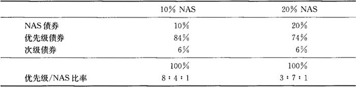 图15.4 创建超NAS债券 资料来源:《超级NAS债券:夏日必读》,《潘恩韦伯房产抵押贷款策划师》(1998年6月9日)第16页。 超级NAS是一种平均期限波动性小于普通NAS的债券。超级NAS债券是通过按时间将NAS的现金流分档,从而使期限较短的债券成为“超级NAS”、期限较长的债券的现金流被返还至优先级债券创建的。结果是一种期限更短、波动性更低、并且本金还款窗口期更短的超级-优先级债券。 证券的NAS比例 NAS的另一个重要特征是NAS的规模相对整个证券规模的大小。也就是说,NAS债券被称为10%NAS债券、20%NAS债券等等。这个比例代表了NAS差级债券的规模占整个证券结构的百分比。例如,假设我们创建了两种NAS债券,一种是10%NAS,另一种是20%NAS(见表15.9)。此外,假设两个结构都在NAS债券之下含有6%的次级债券。比较这两个证券的结构,规模较大的NAS债券(即20%NAS)具有更低的优先级债券/NAS债券比率,从而导致支持或缓冲NAS现金流波动性的债券更少。这意味着规模较小的NAS具有更低的平均期限波动性,因此是更佳的NAS债券。 表15.9 NAS债券的比较