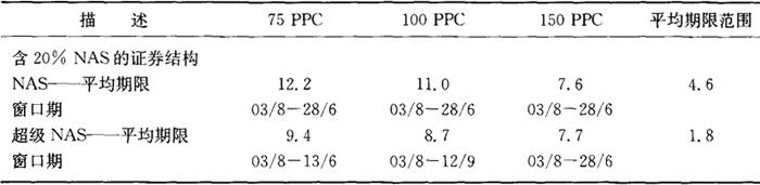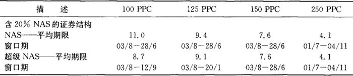 *PPC是指发行说明书中的提前还款速度假设。例如,100PPC是假设的提前还款向量。 超级NAS债券与NAS债券的比较 正如我们先前提到的那样,超级NAS债券是标准NAS债券的一种期限更短、更为稳定的变型。超级NAS债券还具有更短的本金还款窗口期,因为NAS的尾部现金流被转给了优先级债券。表15.11比较了NAS债券与规模类似的超级NAS Alt-A抵押债券的平均期限波动性和本金还款窗口期。 表15.11 超级NAS与NAS